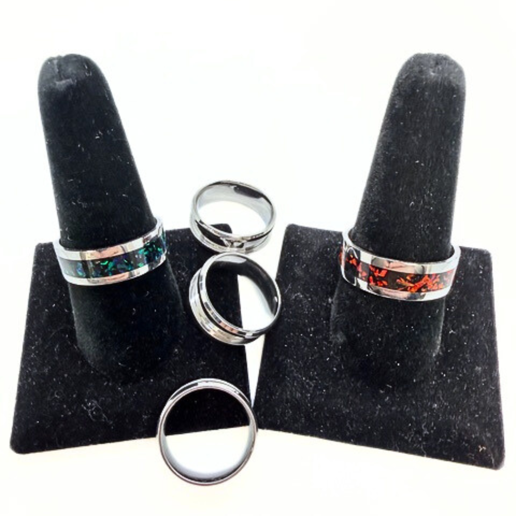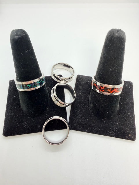 In this workshop, students will inlay synthetic opal into a stainless steel ring and real opal chips into a stainless steel ring. This class will cover gluing with thick CA glue, curing, filling with Mica powder, filling with thin CA glue, stabilizing, and cutting/polishing. Additional ring kits will be for sale. The class fee is $370.00 and includes all materials and supplies to make two rings, as well as the use of all necessary shop tools. This class is a great companion to Chuck's Sterling Inlay Ring Class--create your rings in Silver and inlay them with Opal