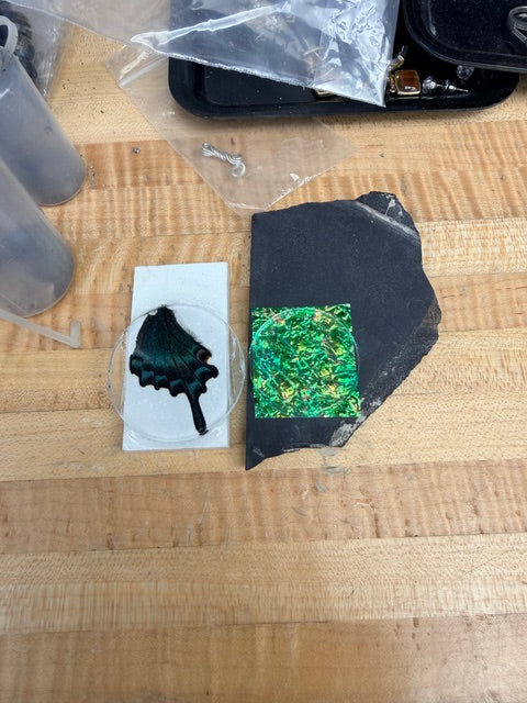This class will focus on creating beyond cabochons. Students will be introduced to intarsia in the form of a Zuni Sunface. Students will learn to make doublets and triplets, and learn to create stone cones. This class will cover drilling into stones using diamond core bits, fitting concave stones with convex stones, and performing chip-and-synthetic crushed opal inlay into stones. Alternate cabs will be created using dried natural items, like butterfly or dragonfly wings, etc, and other materials like synthetic Dichro material or carbon fiber. Stabilization, custom tinting, and a little hand-carving will also be covered. The class fee is $475, which includes all necessary materials and supplies, as well as access to all required shop tools.