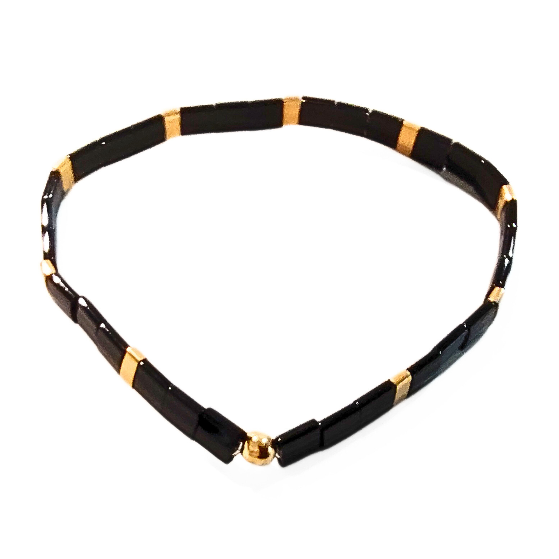 DJT-054 Miyuki Bead Stretch Bracelet, Black and Gold