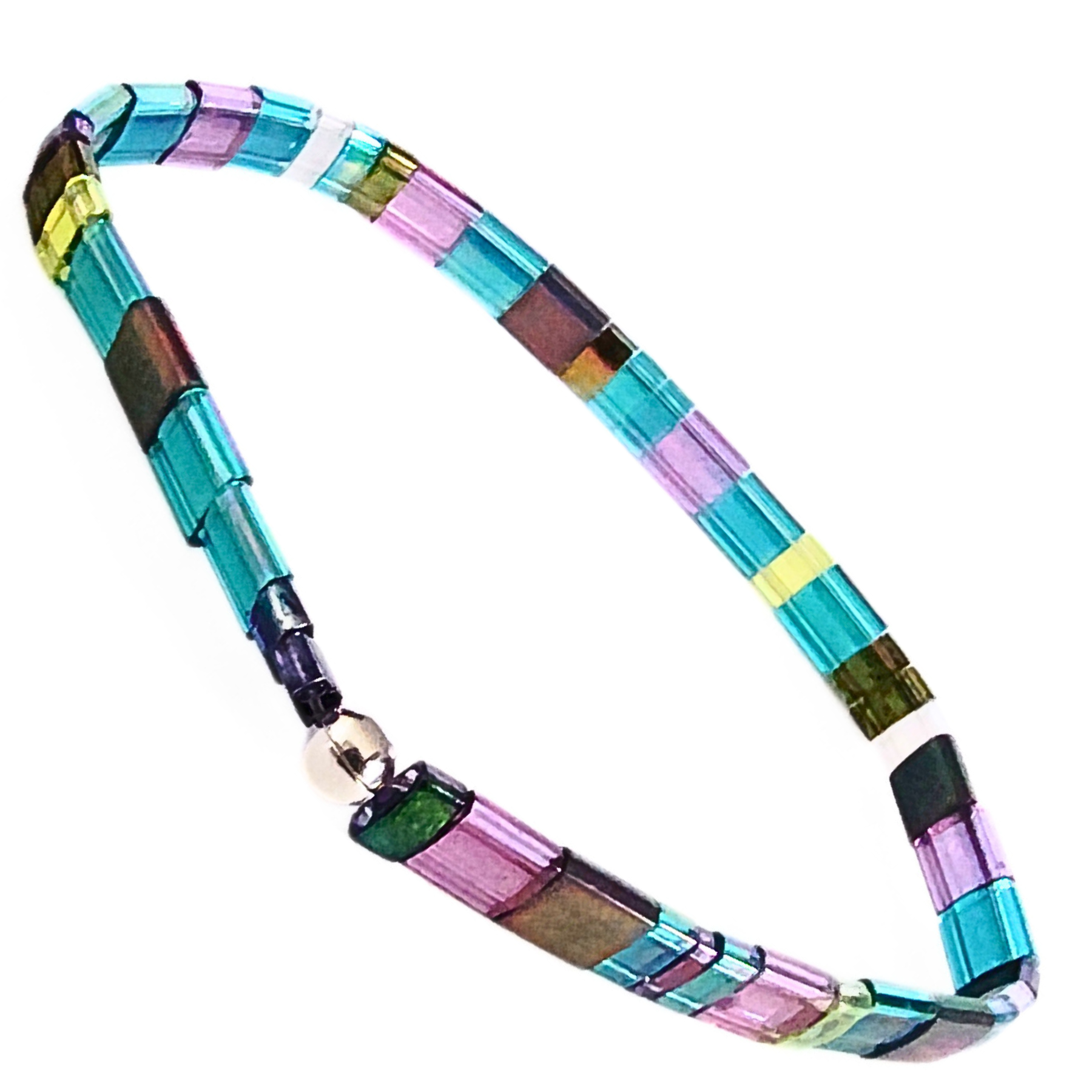 Lovely stretch bracelet featuring shimmery flat double holed translucent multicolor Miyuki glass beads. Fun by itself, or wear several together for a bold look. Created by artist Deb Thornton.