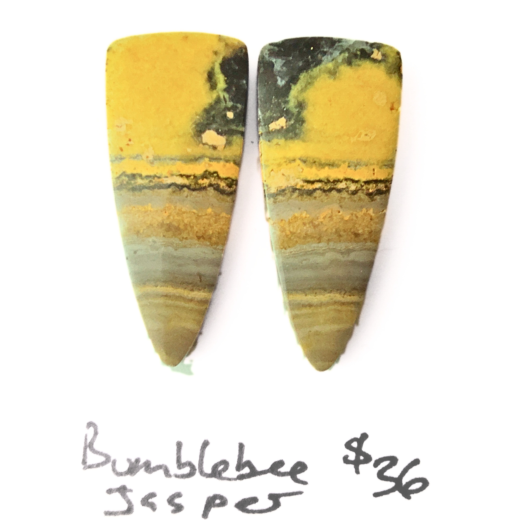 Stunning elongated triangle shaped Bumblebee Jasper cabochon pair in tones of bright yellow, gray, white, and black, perfect for a bold pair of earrings, pendants, or rings. Approximately 14mm x 31mm.