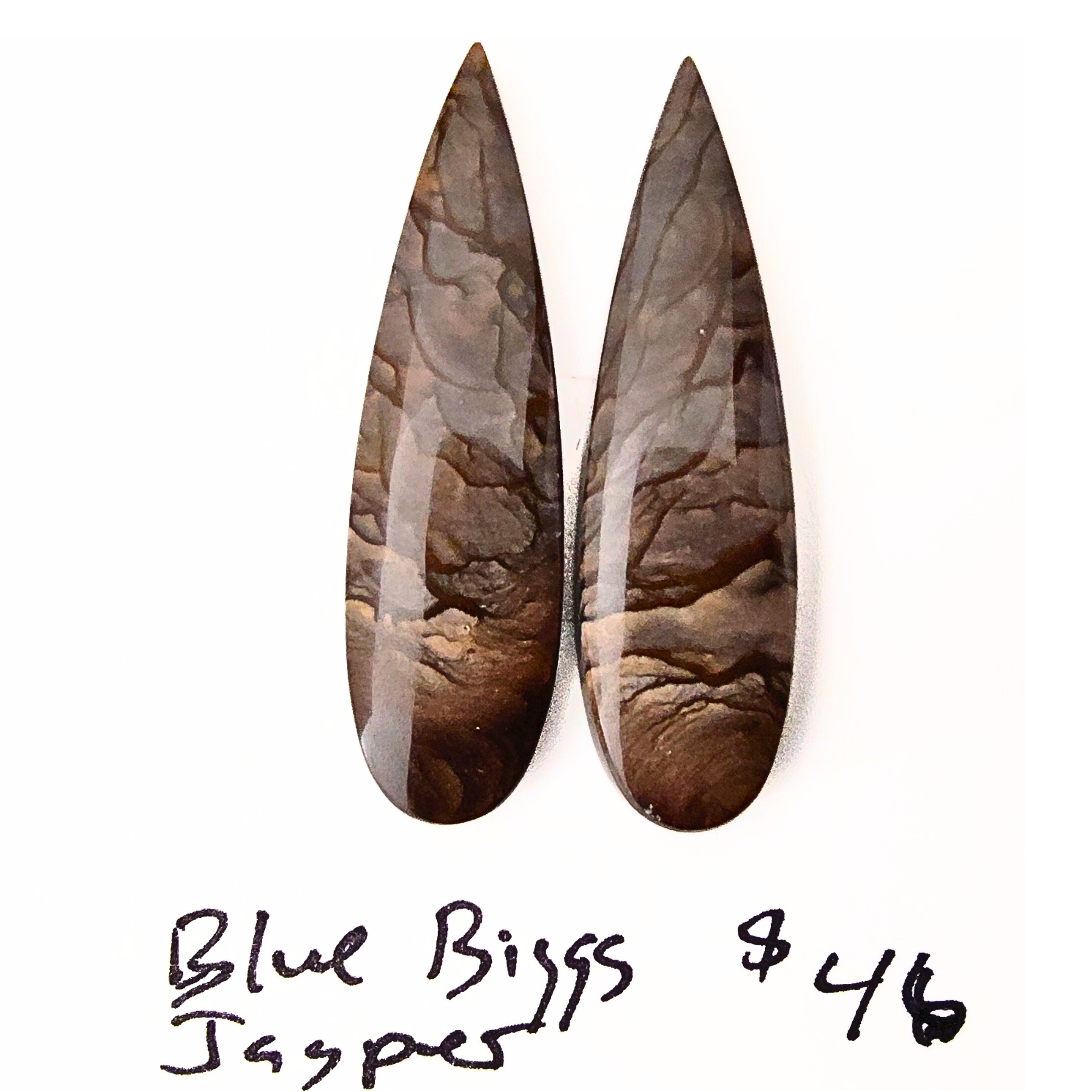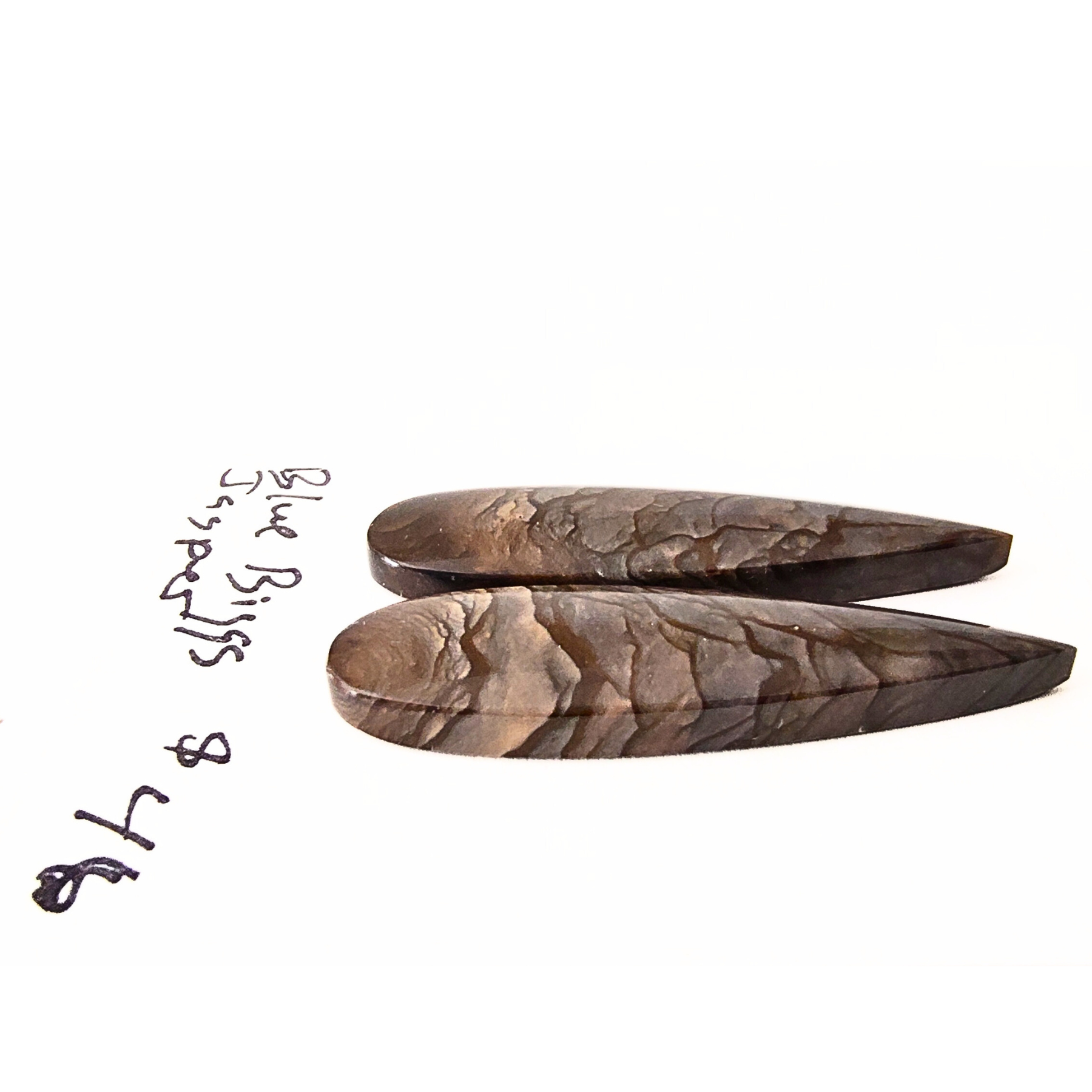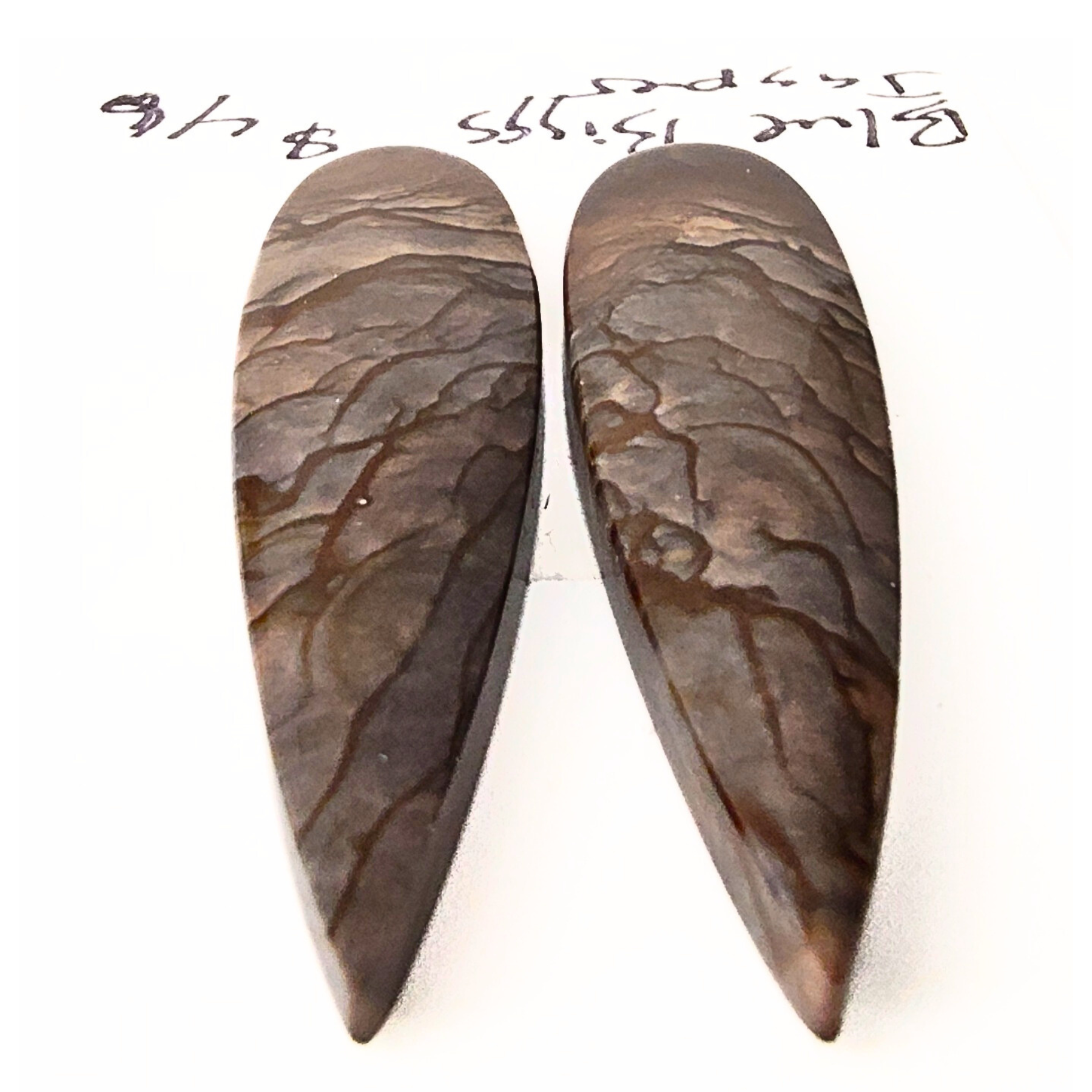 Two chunky flat-edged elongated teardrop shaped cabochons, richly colored in smokey blue-gray and taupe with bld veins of rich brown for a stunning pictorial effect. These beautifully matched stones are perfect for a bold pair of earrings or statement rings, or a nice pair of pendants.. Approximately 11mm x 40mm.