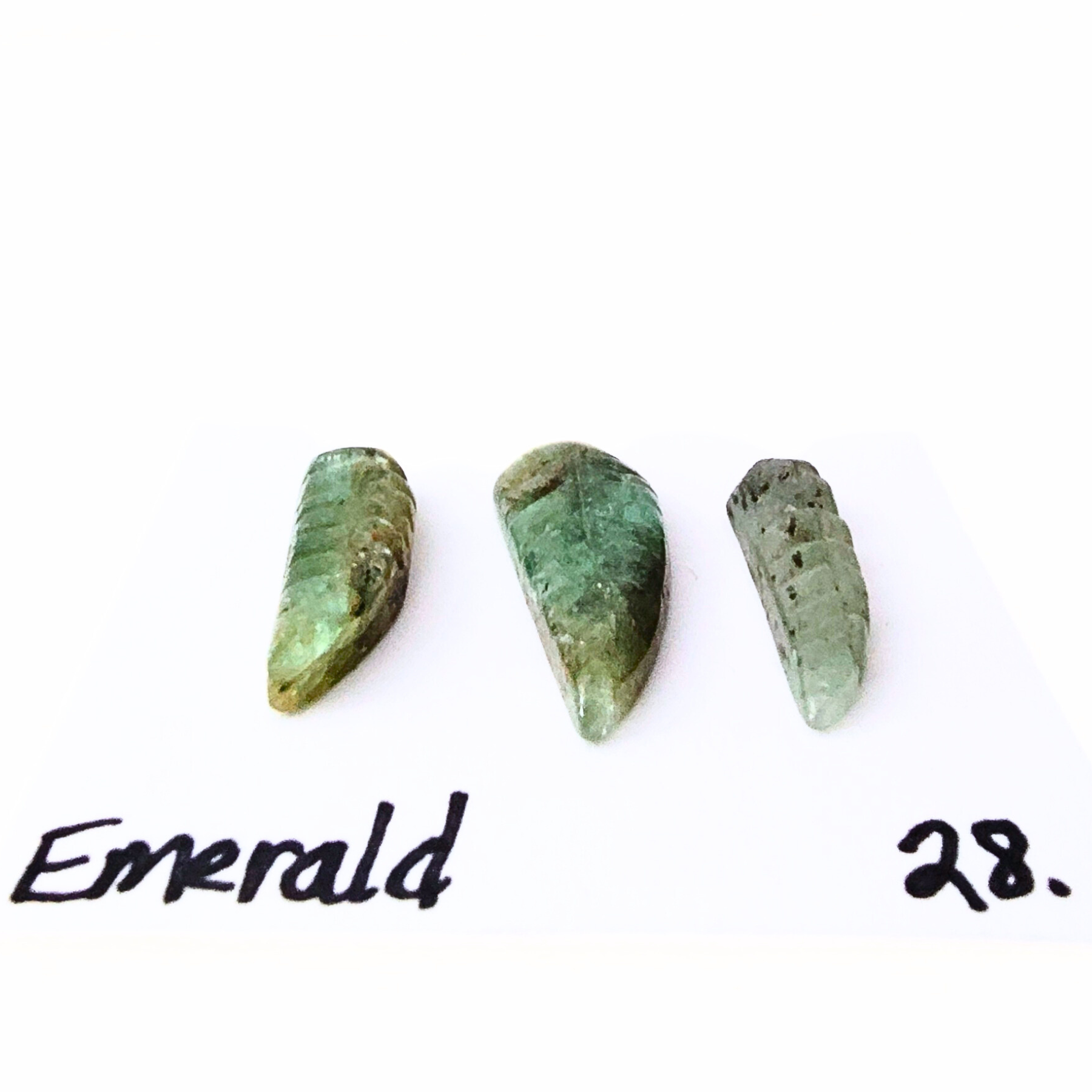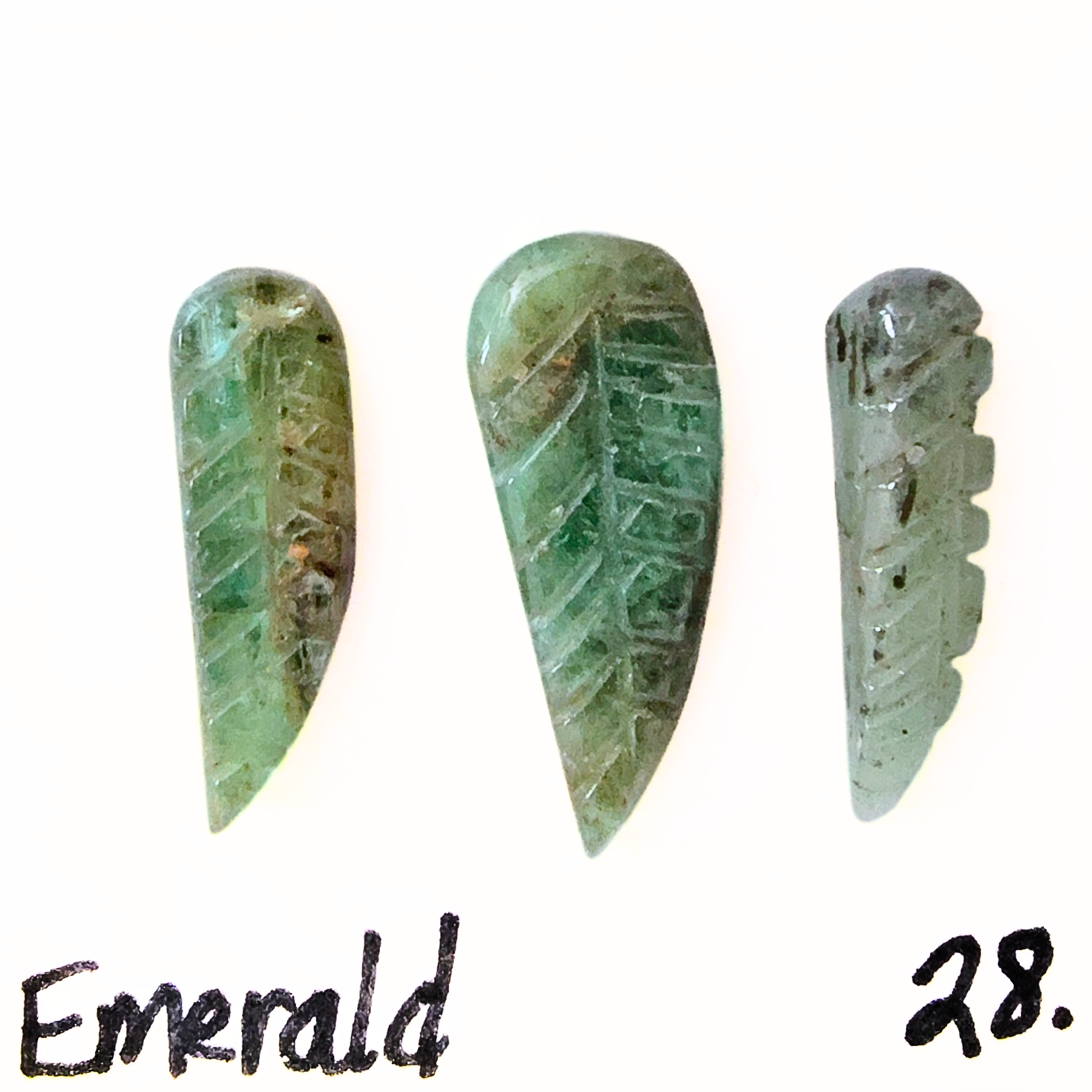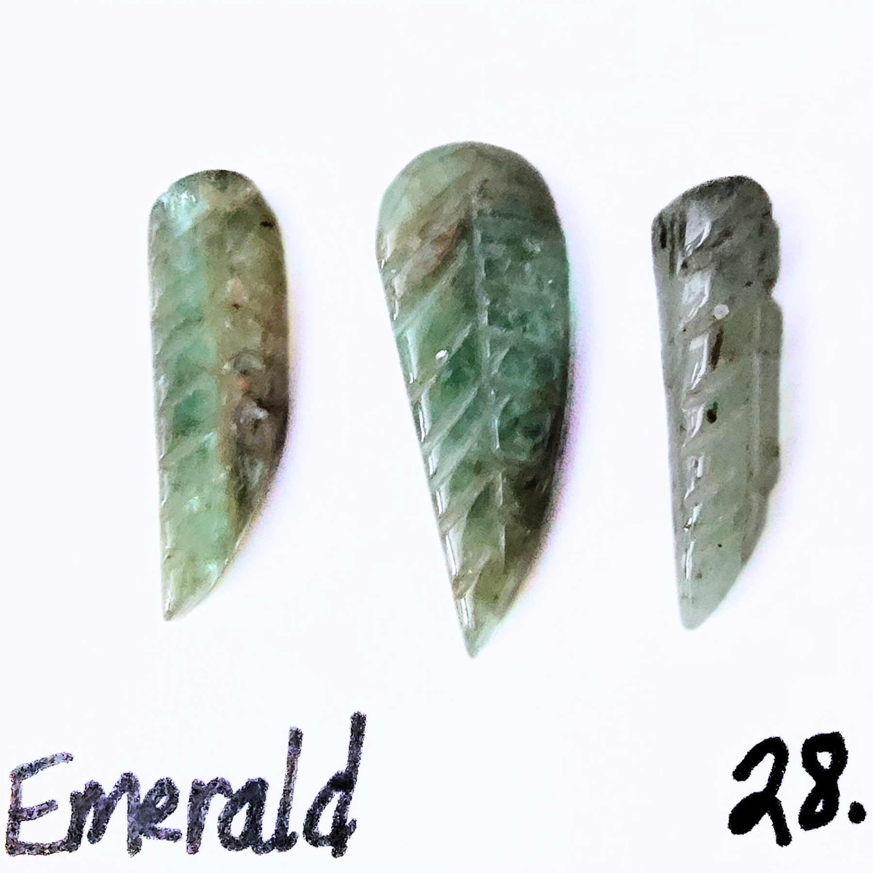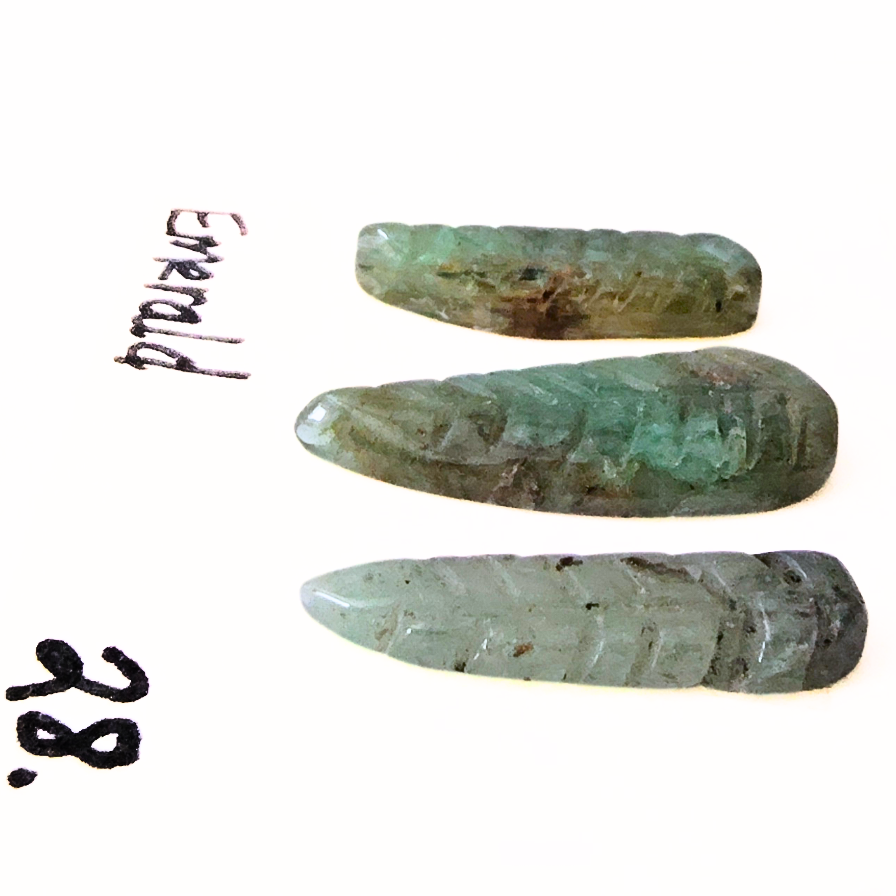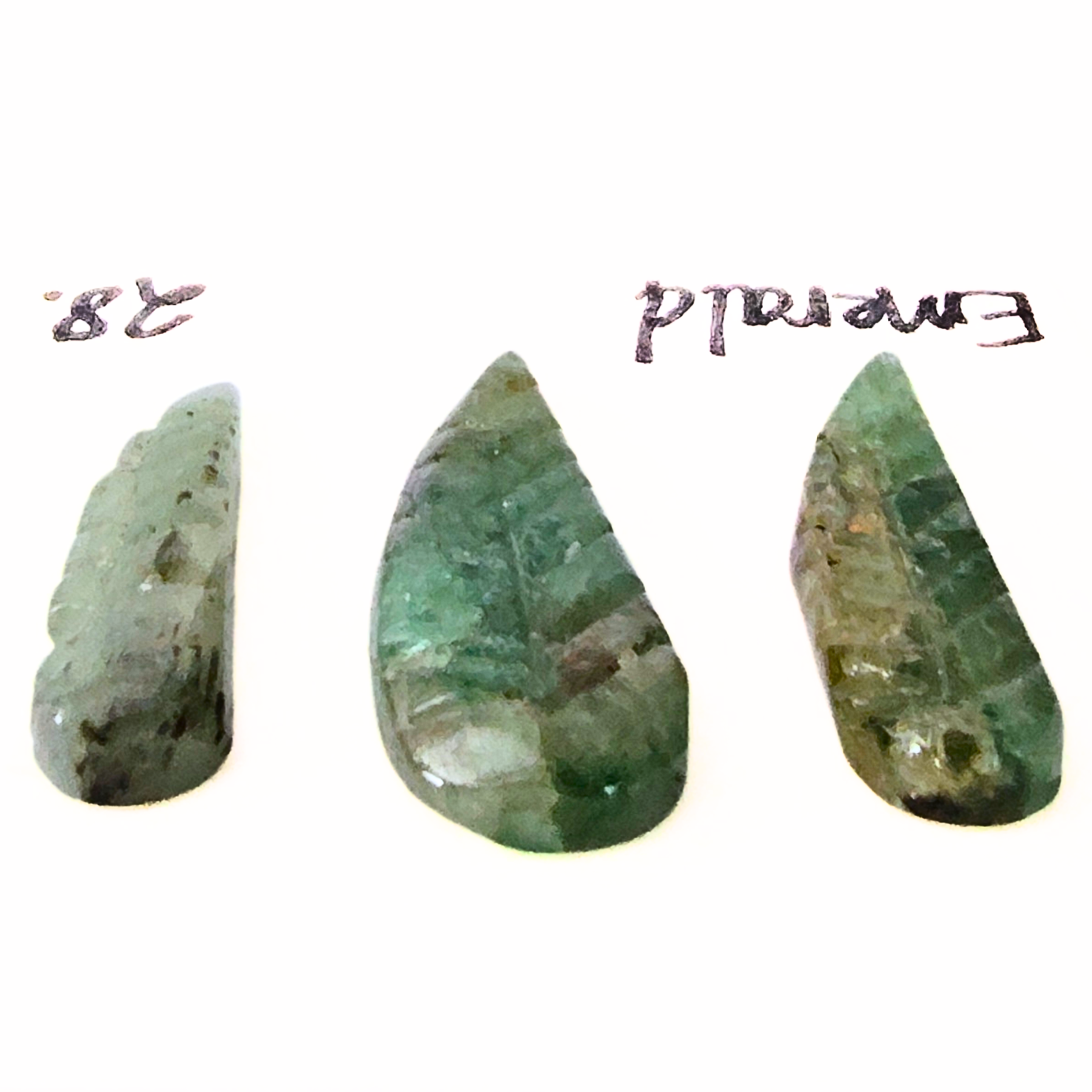 Lovely trio of natural Emerald cabochons, carved into leaf shapes, in translucent green with some brownish patches for visual interest. These low-profile stones are flat backed for easy bezel setting, and can be used as accent pieces, combined for a uniue composition, or pretty earrings or rings. Approximately 6 x 19mm, 8 x 22mm, and 5 x 19mm.