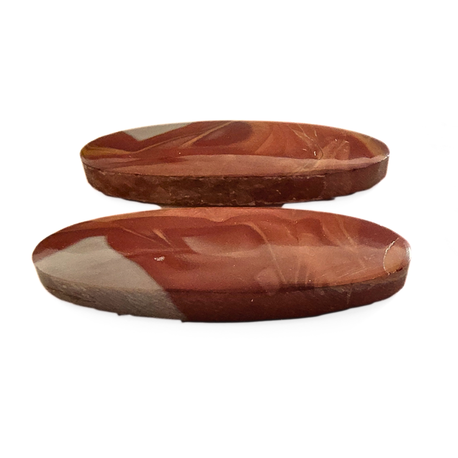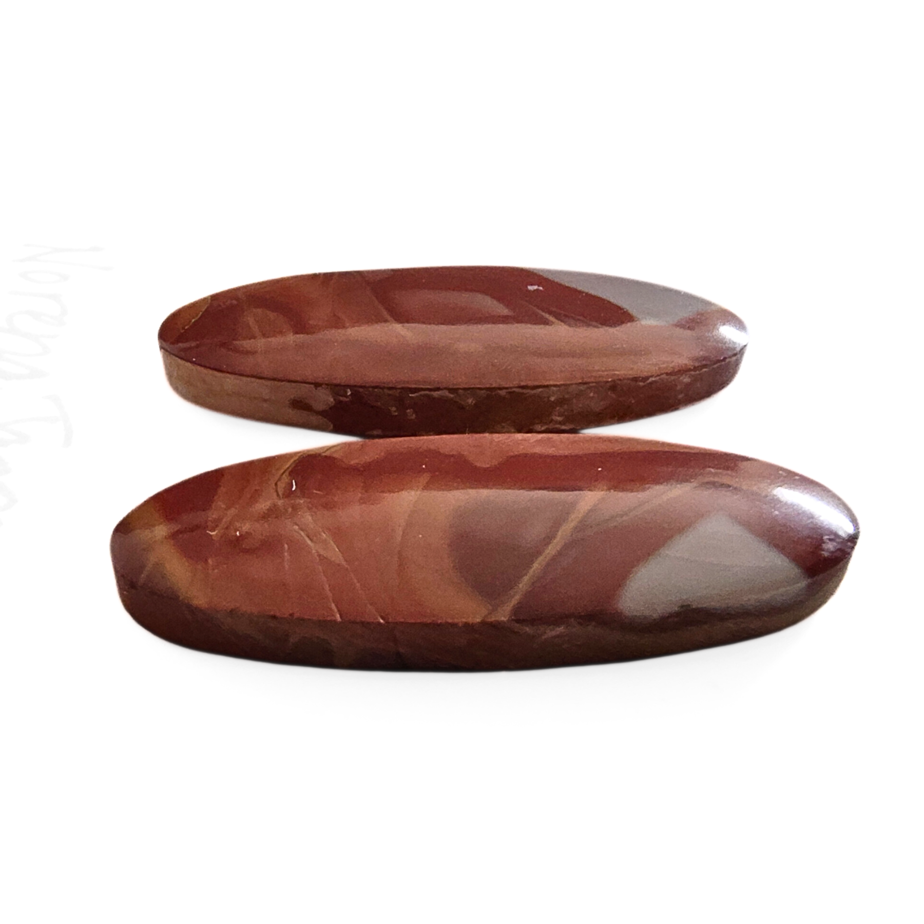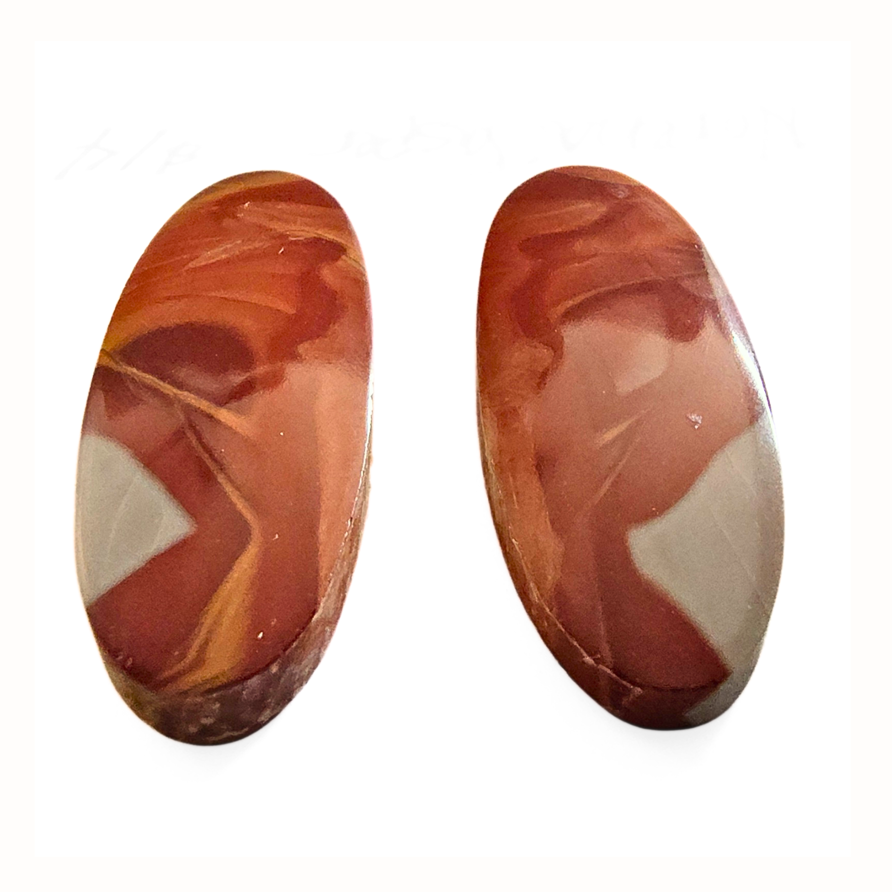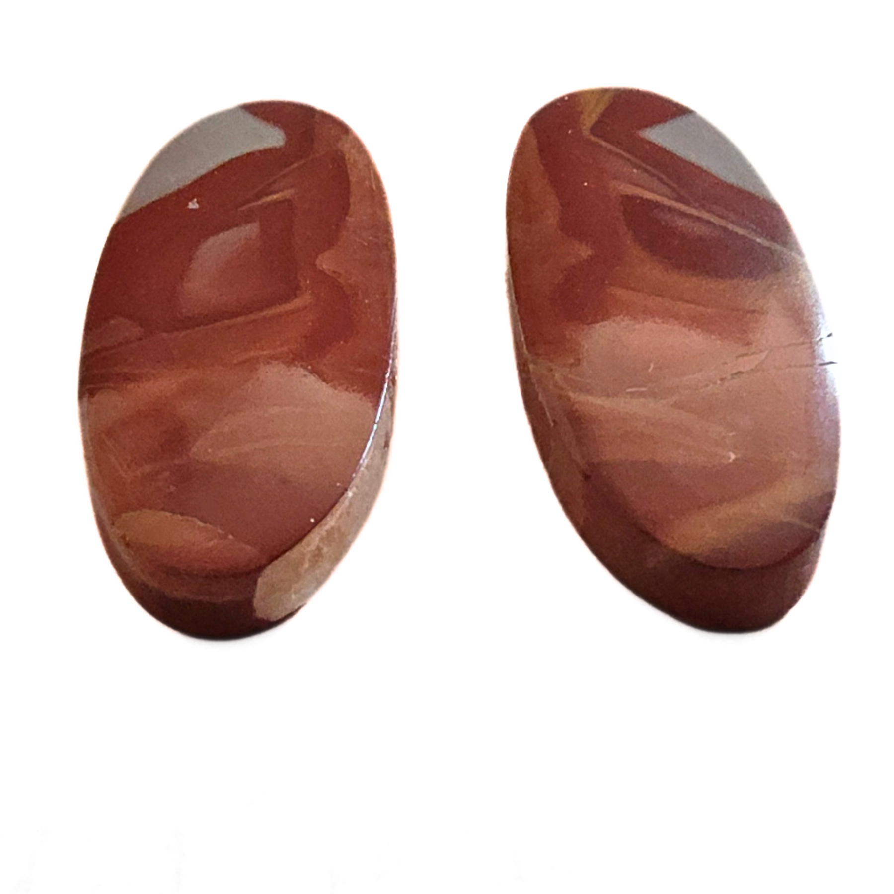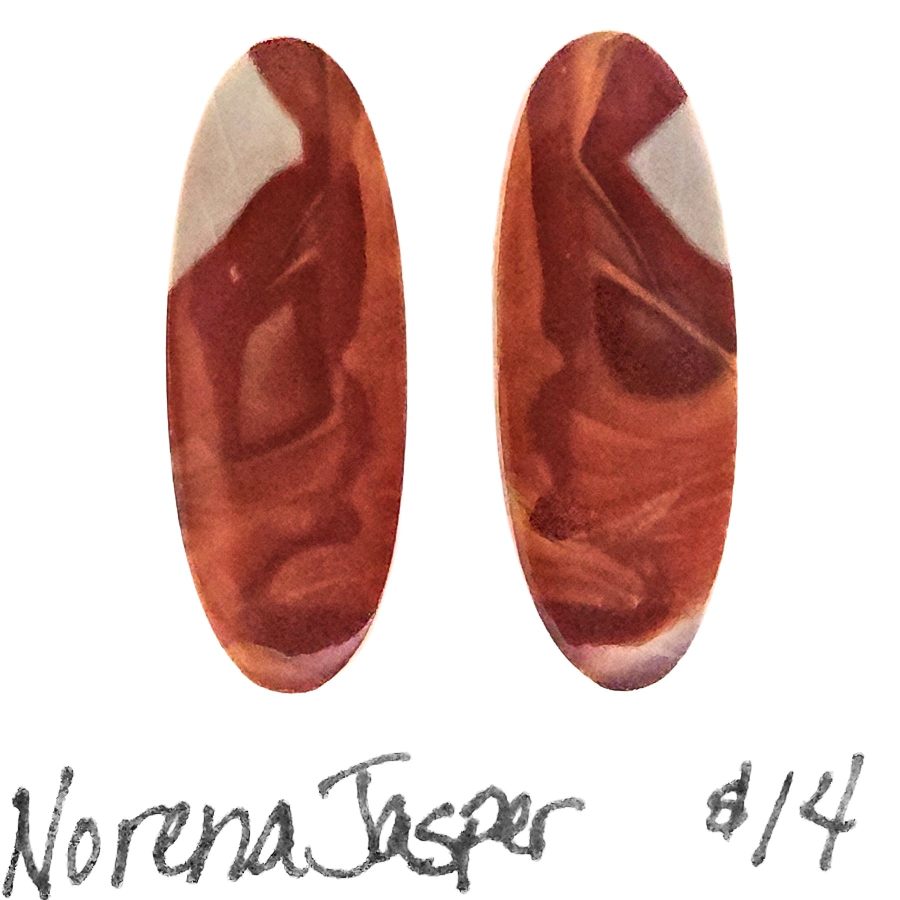 Two gorgeous elongated oval shaped Norena Jasper cabochons in rich swirls of rust, gray, caramel, and gold. These fabulous well-matched stones are perfect for a pair of earrings, rings, or pendants. Approximately 11mm x 30mm.