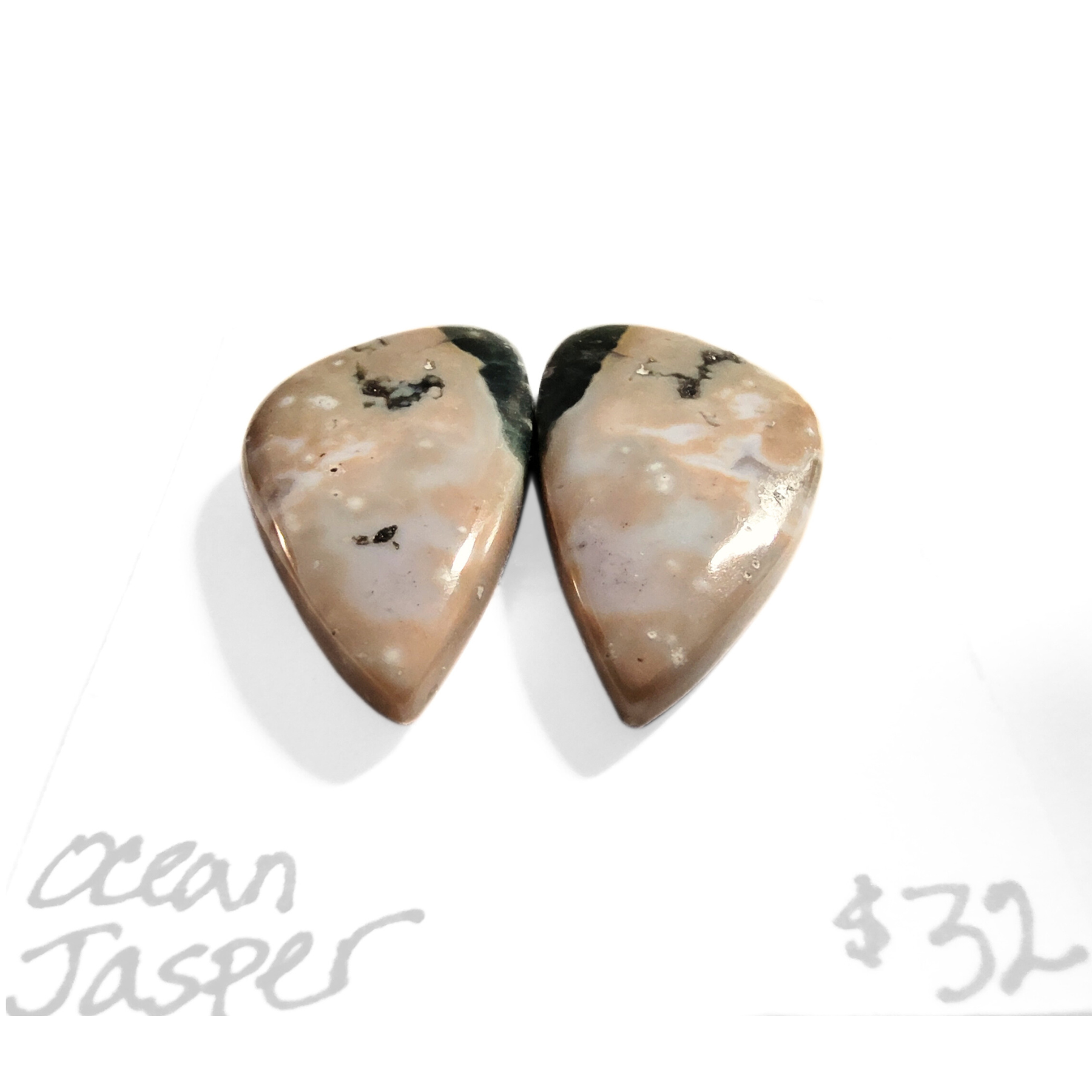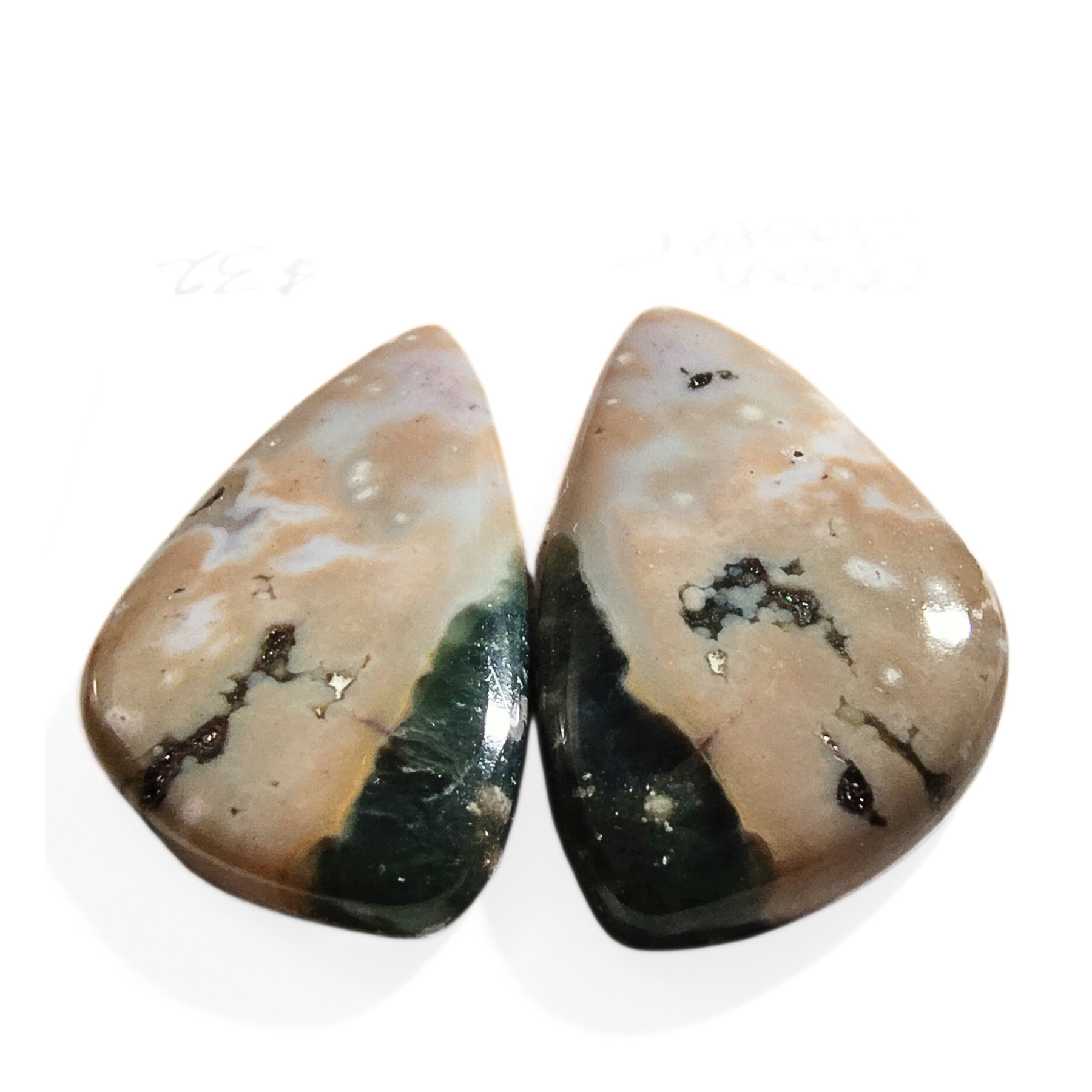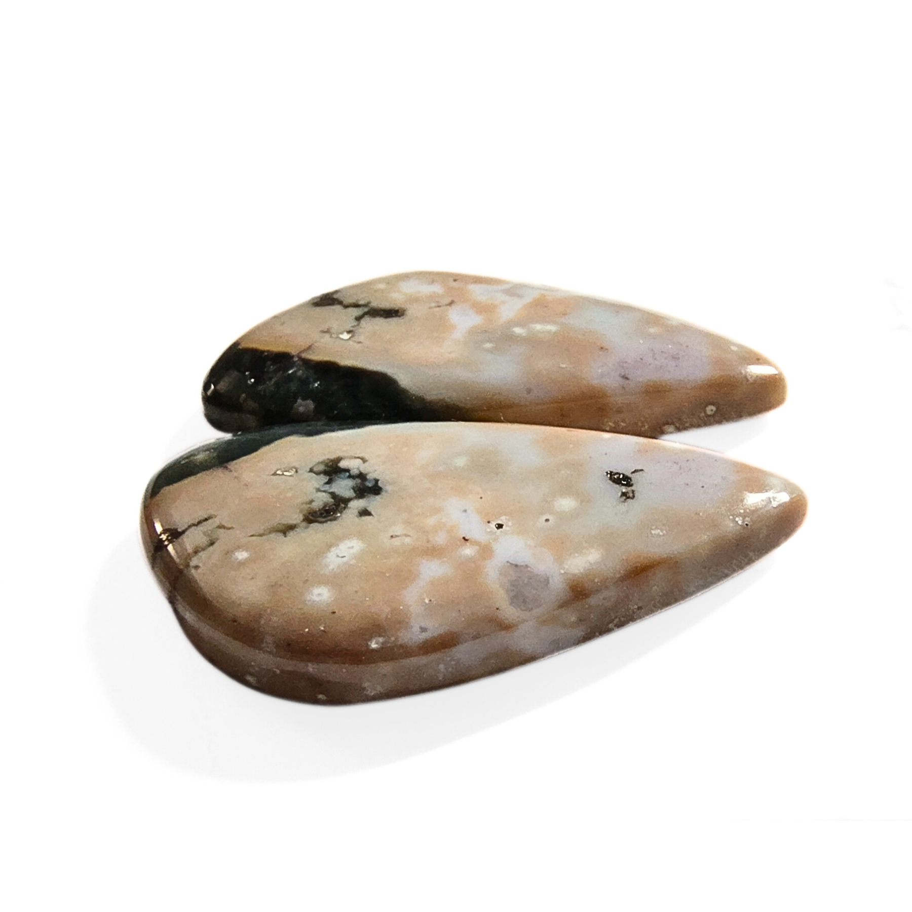 Two rounded triangle shaped cabochons with soft hues of mauve, green, tan, white, and gray with characteristic orbicular forms and beautiful banding. These fabulous well-matched stones are perfect for a pair of earrings, rings, a pair of pendants or combine for a gorgeous bracelet. Approximately 14mm x 8mm.