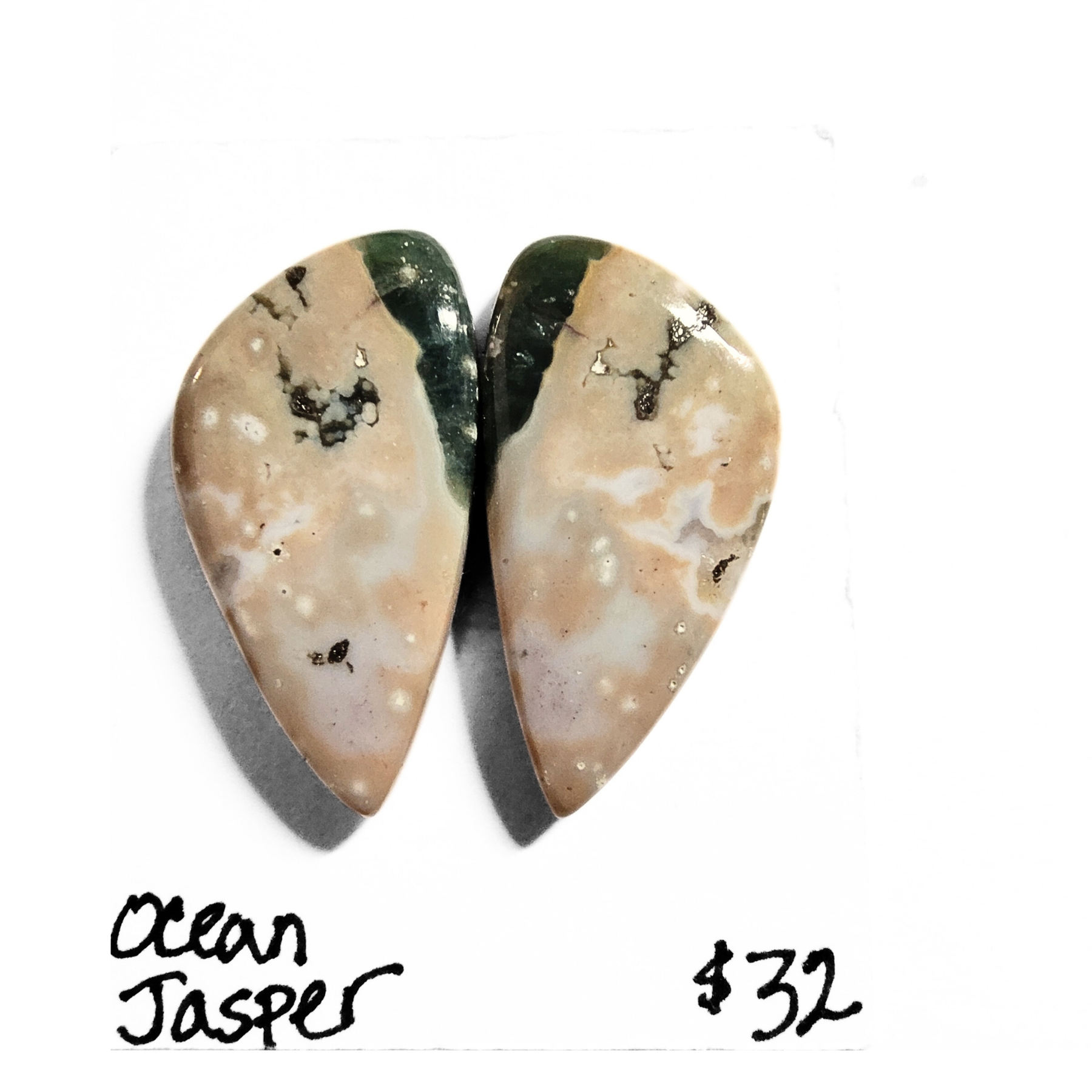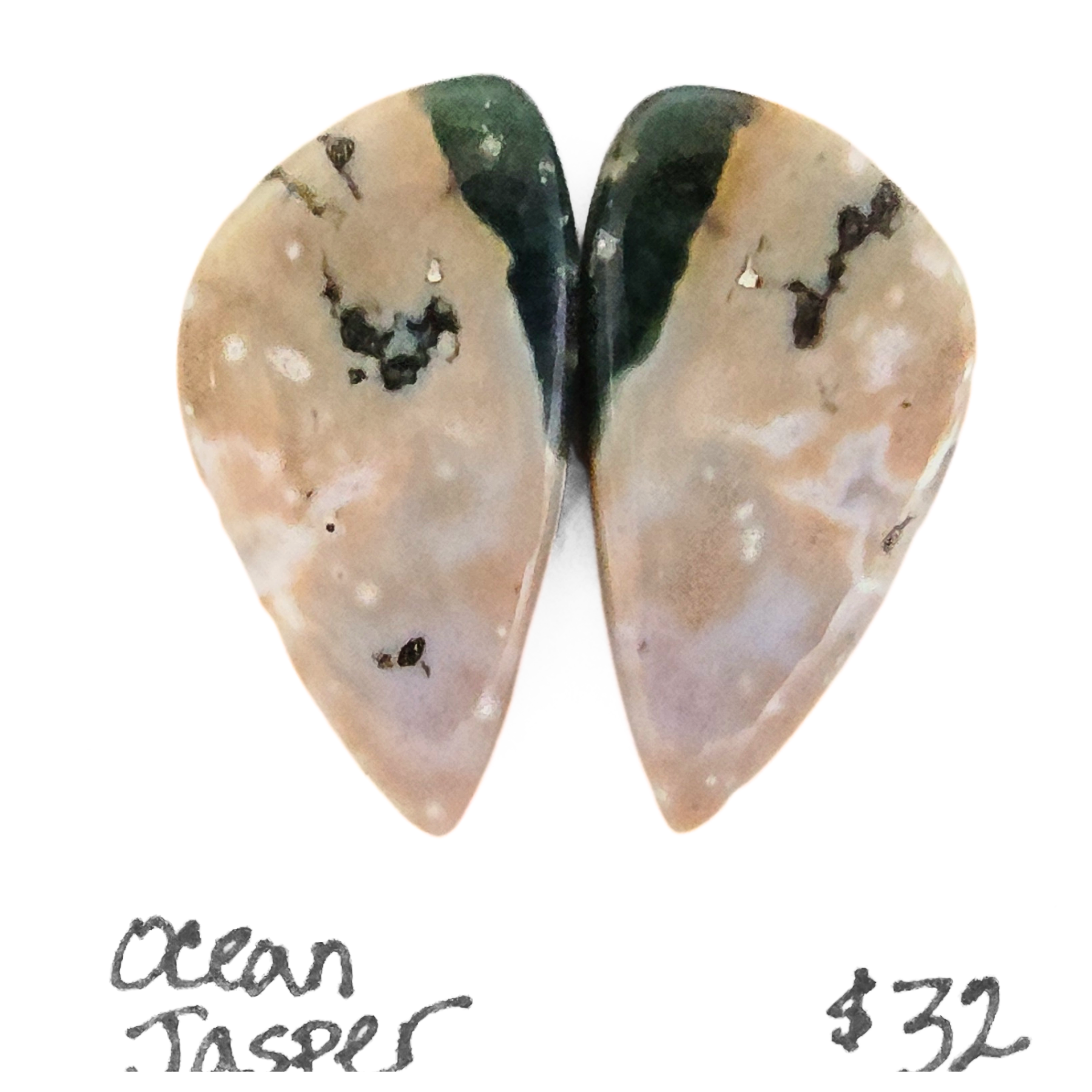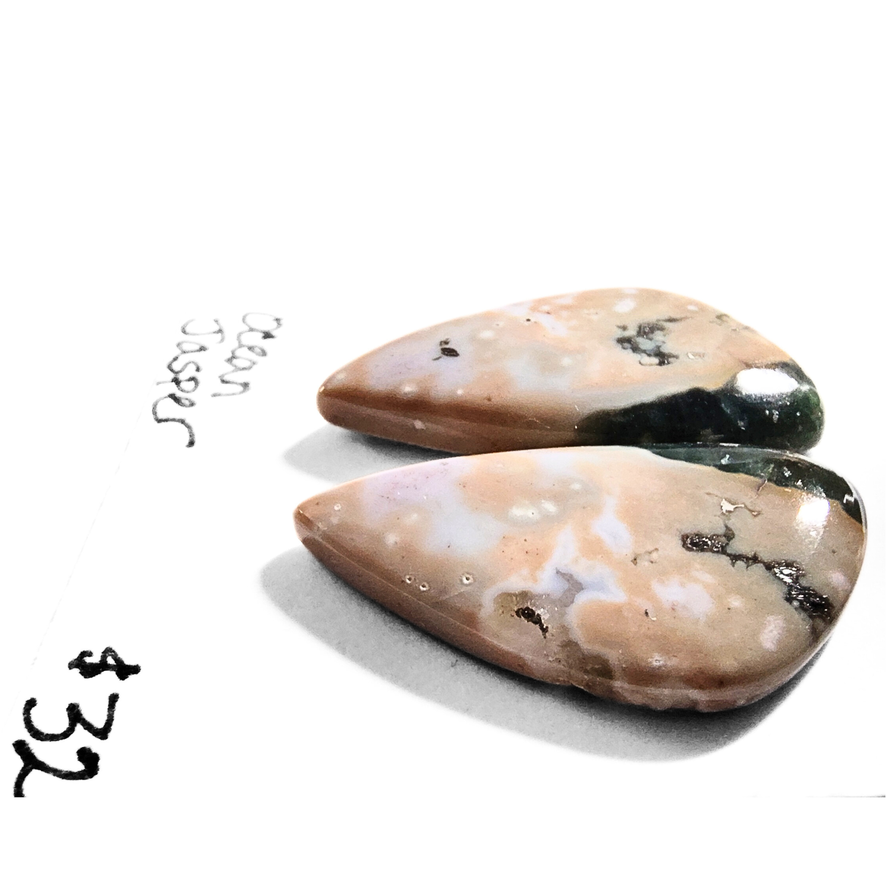 Two rounded triangle shaped cabochons with soft hues of mauve, green, tan, white, and gray with characteristic orbicular forms and beautiful banding. These fabulous well-matched stones are perfect for a pair of earrings, rings, a pair of pendants or combine for a gorgeous bracelet. Approximately 14mm x 8mm.