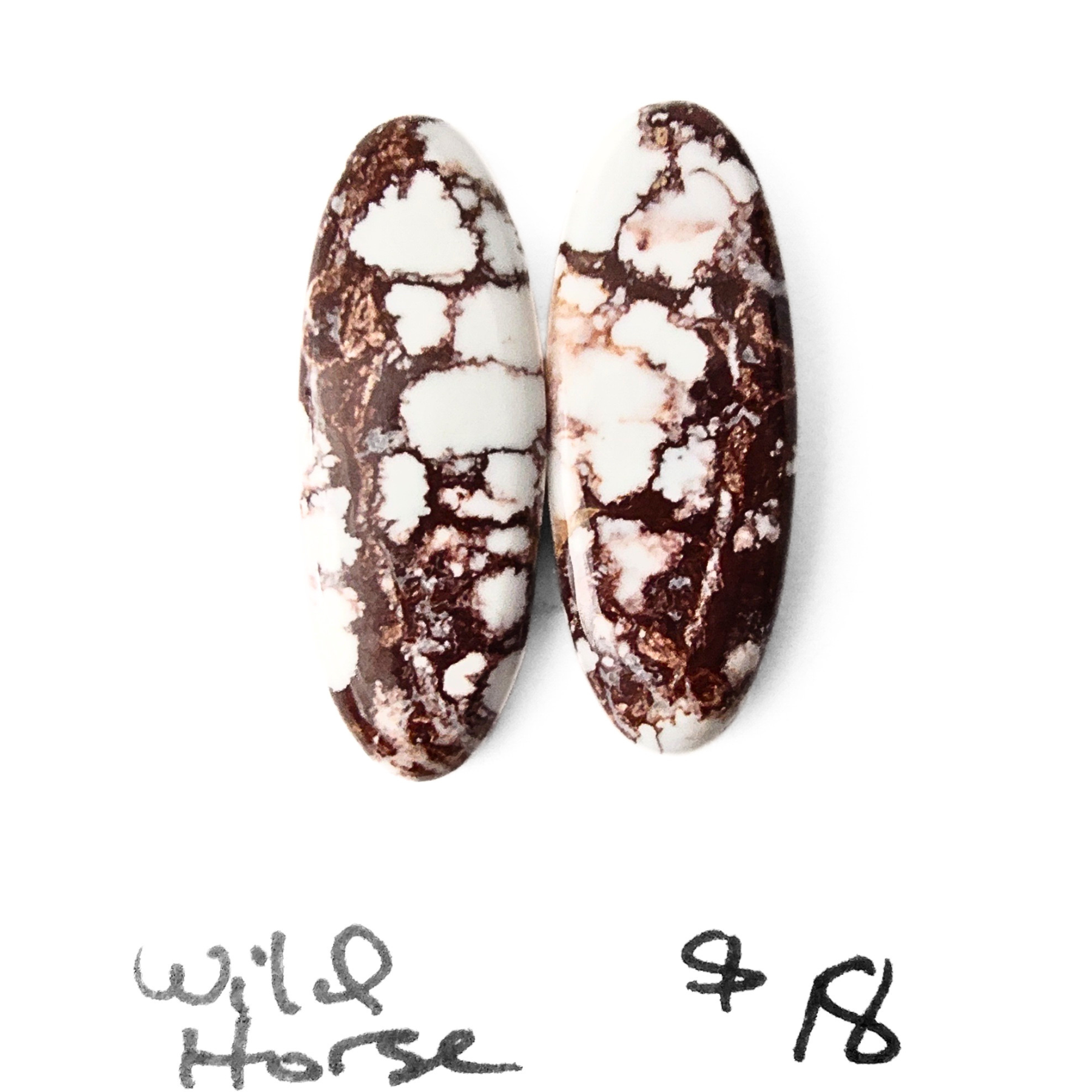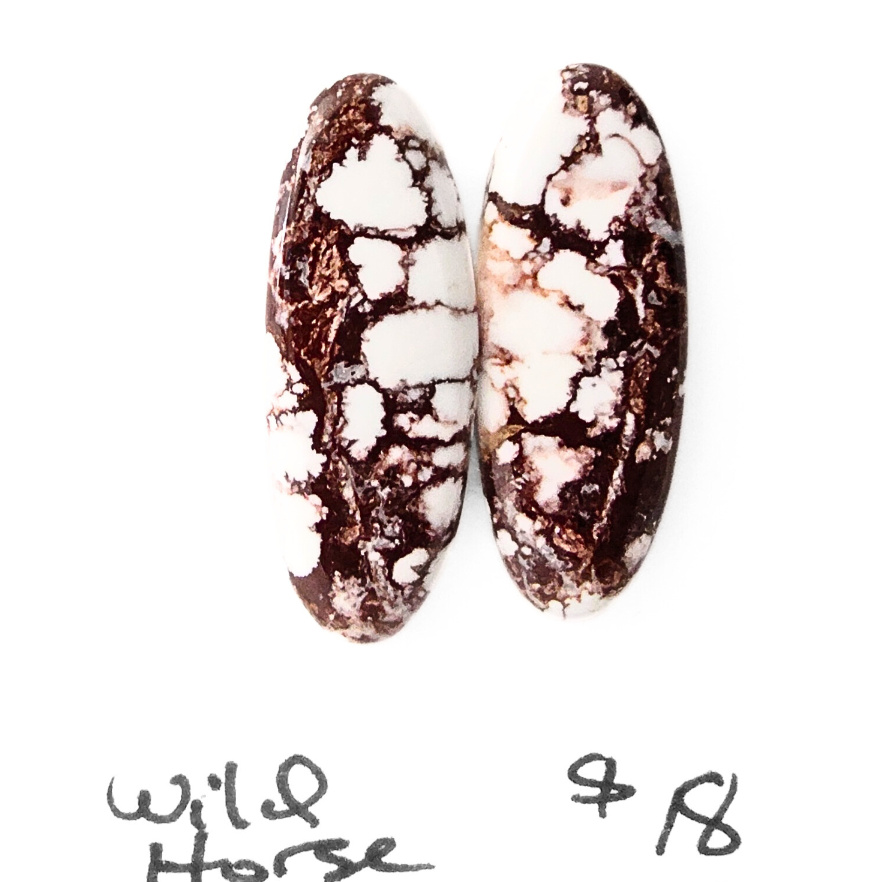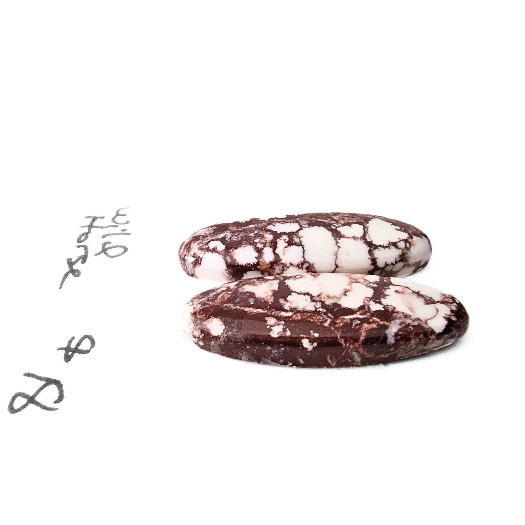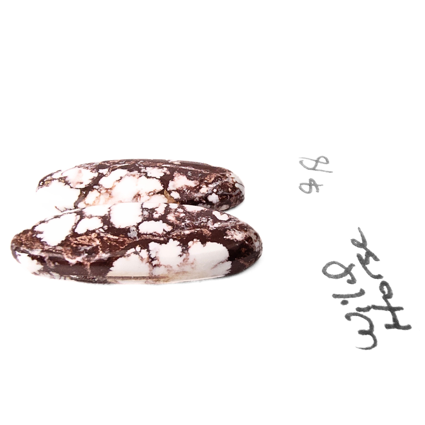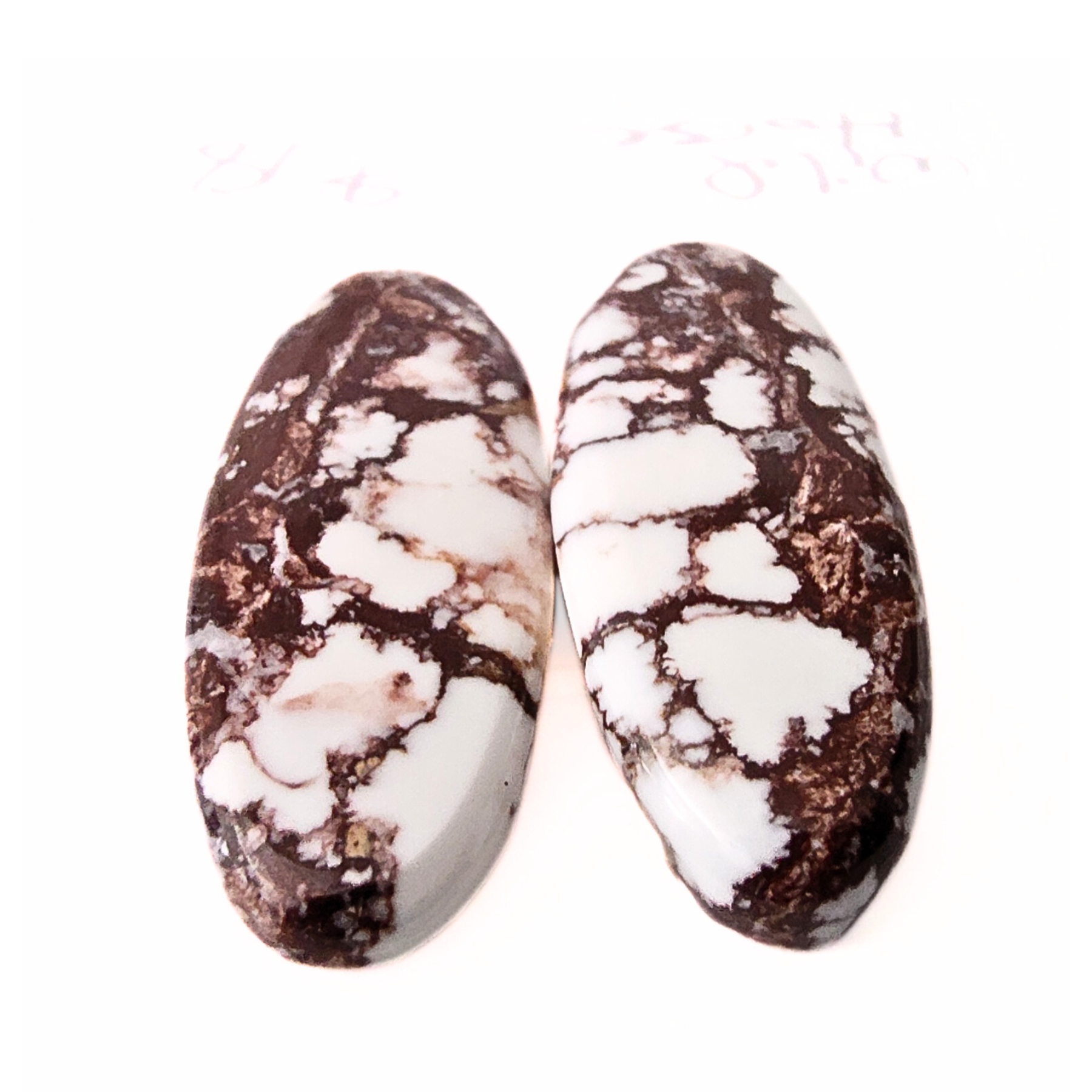 Elongated oval shaped, flat-edged Wild Horse Magnesite cabochons in rich shades of brown with irregular spots of pure white. Nice size for a lovely pair of earrings, pretty pendants or combine for a unique bracelet, approximately 9mm x 25mm.