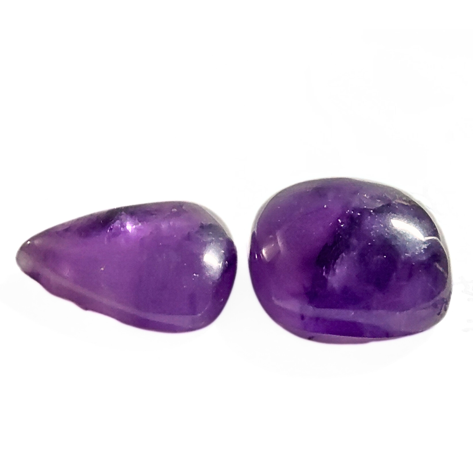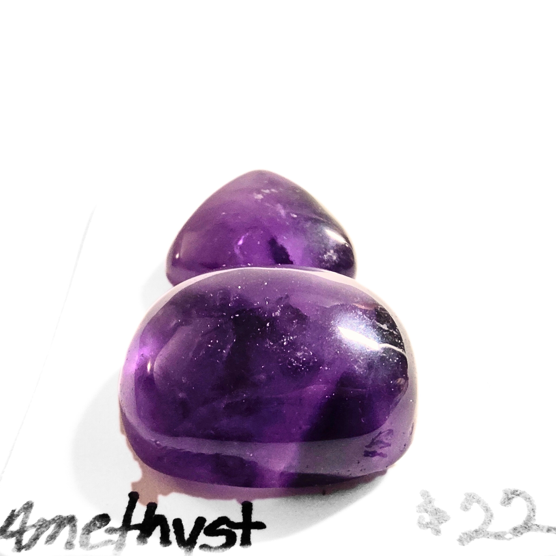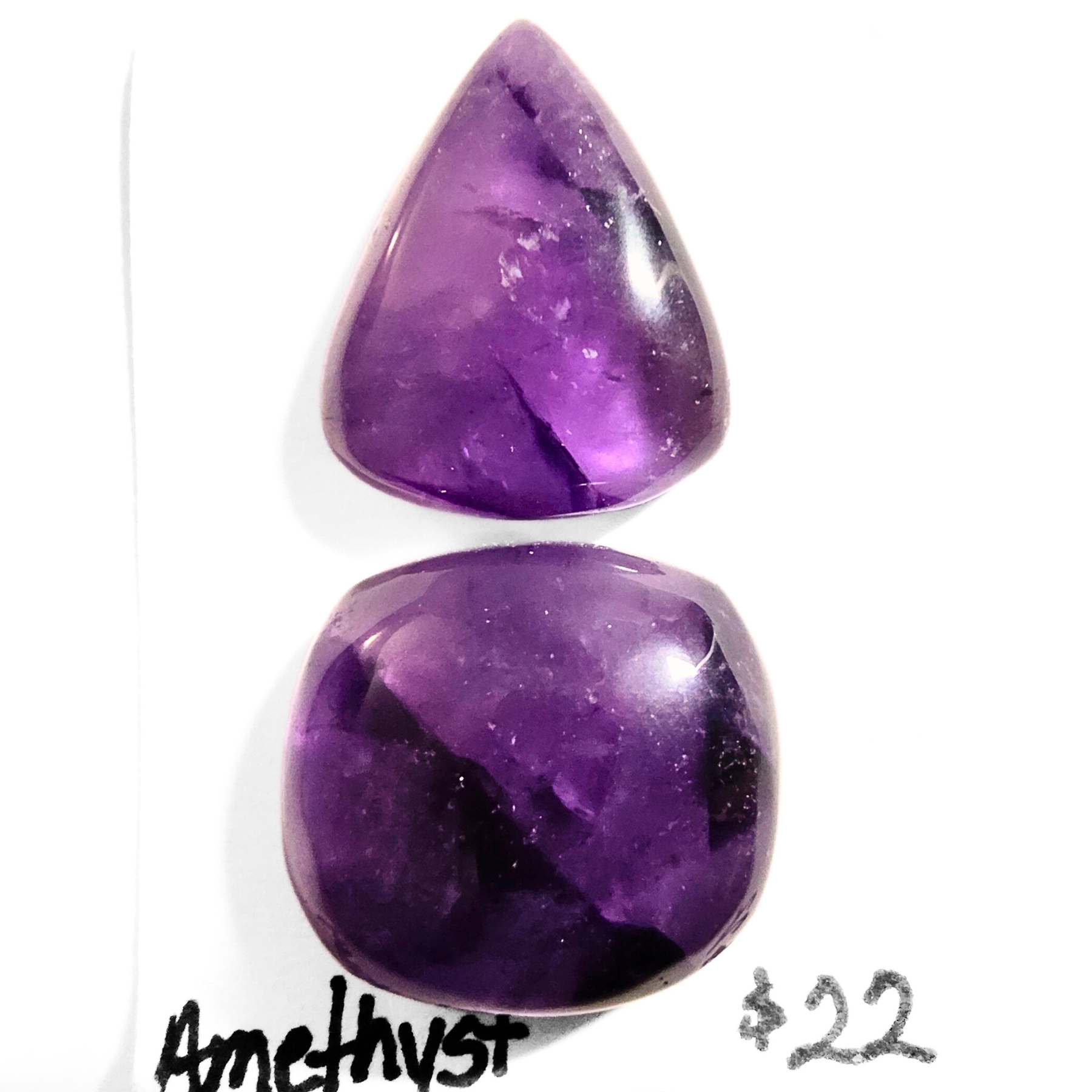 Beautiful mis-matched pair of cabs in translucent shades of rich purple. These bold high profile stones, a rounded triangle and rounded rectangle, nicely complement one another so you can combine for a dramatic statement piece or use them separately. Triangle is approximately 20mm x 23mm and rectangle is 20mm x 22mm, perfect for fabulous rings, bracelets or pendants.