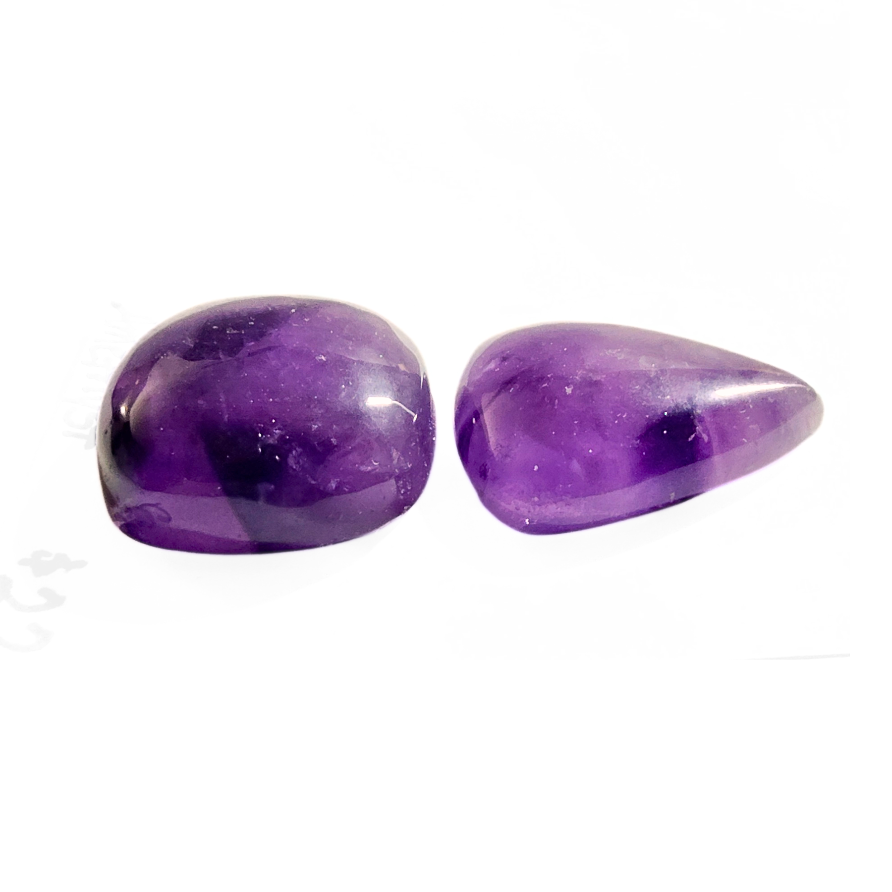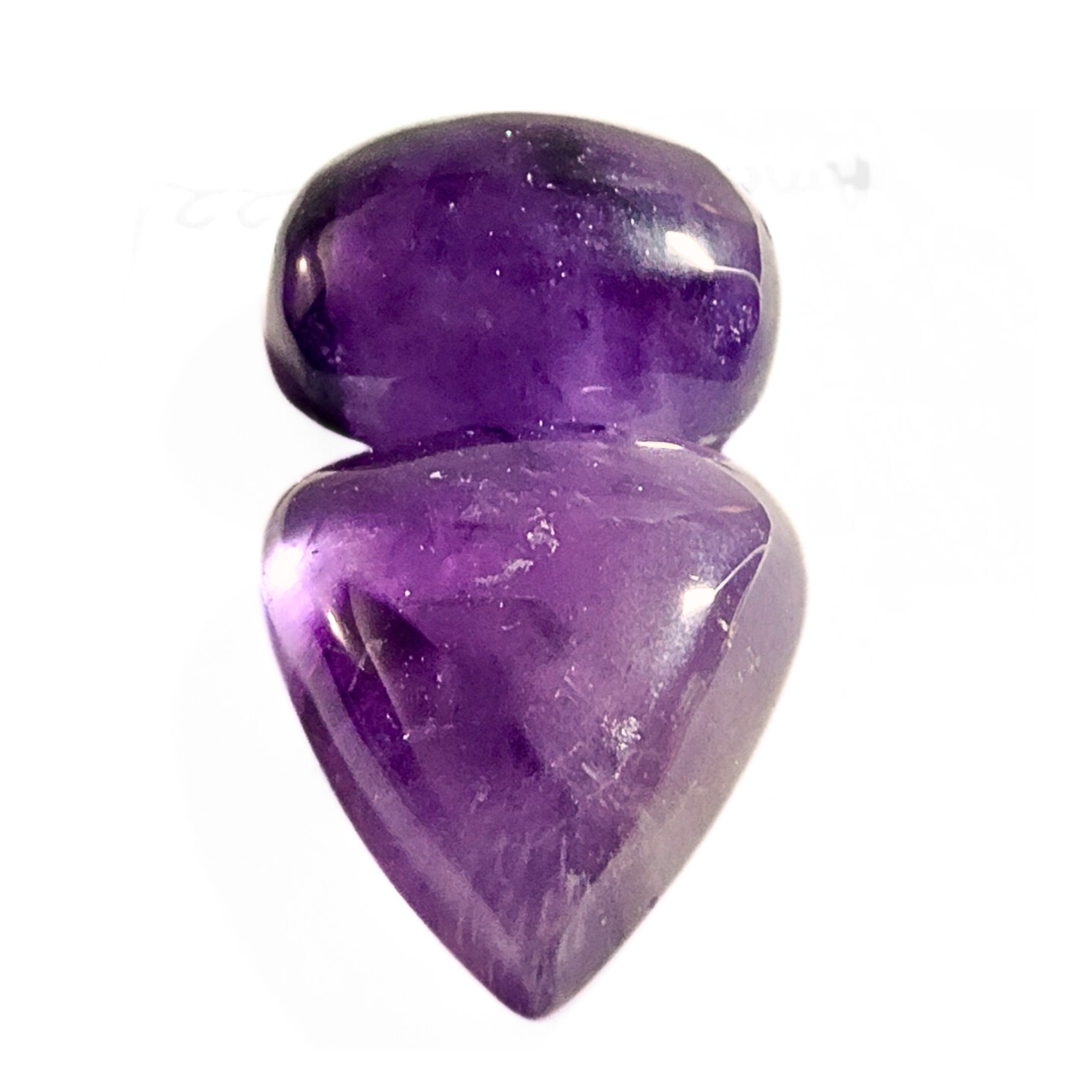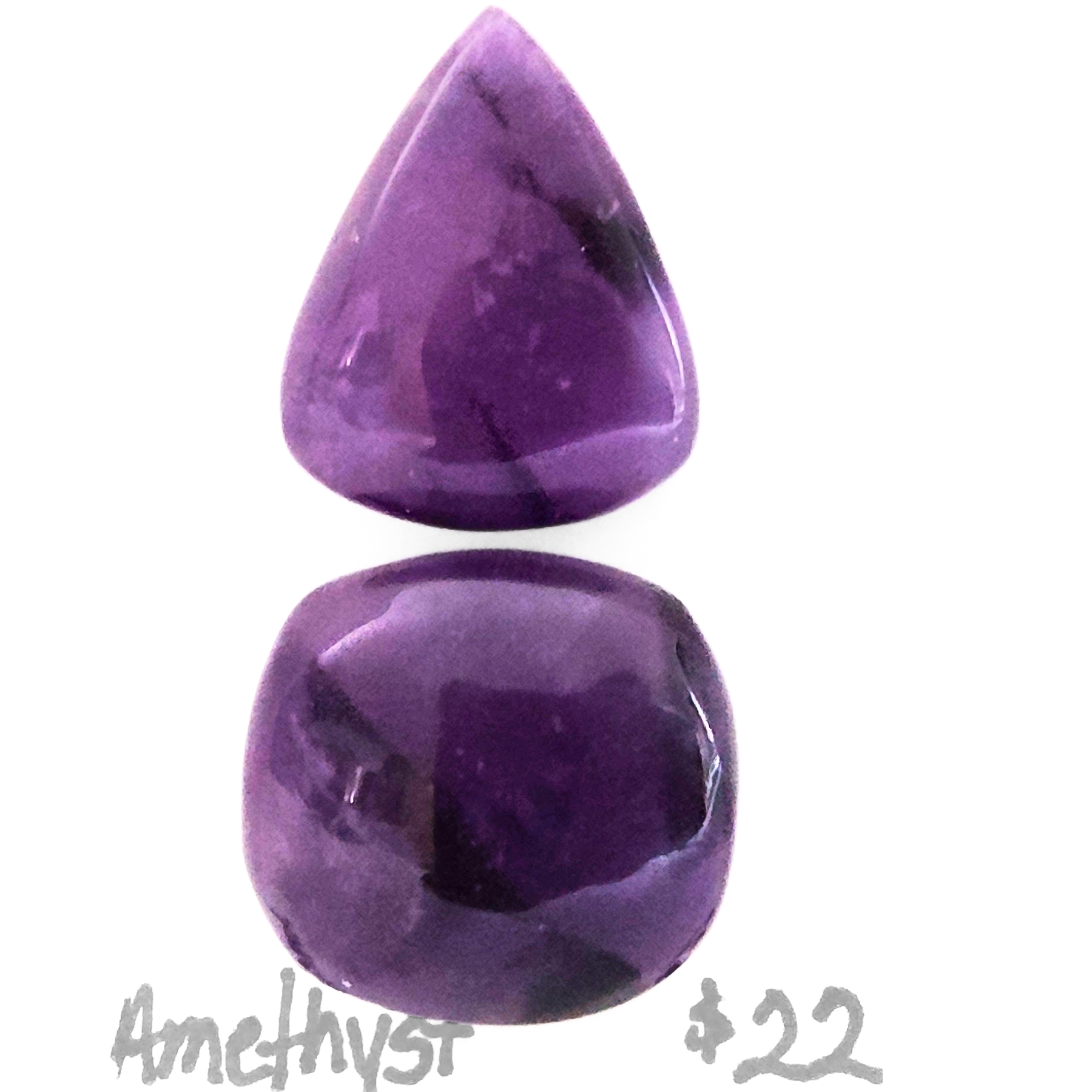 Beautiful mis-matched pair of cabs in translucent shades of rich purple. These bold high profile stones, a rounded triangle and rounded rectangle, nicely complement one another so you can combine for a dramatic statement piece or use them separately. Triangle is approximately 20mm x 23mm and rectangle is 20mm x 22mm, perfect for fabulous rings, bracelets or pendants.